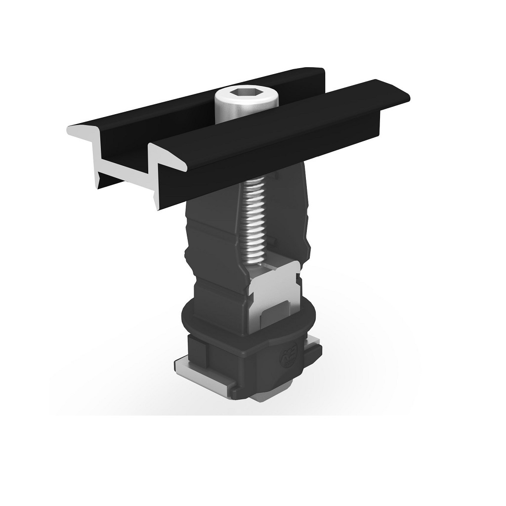 Schwarz eloxierte Universal Modulmittelklemme zum Fixieren von Solarmodulen mit Rahmenhöhen 25-40 mm. Nicht kompatibel mit dem K2 Dome 6 System. Material: Eloxiertes Aluminium EN AW 6063 T66, Badamid B70, Edelstahl A2