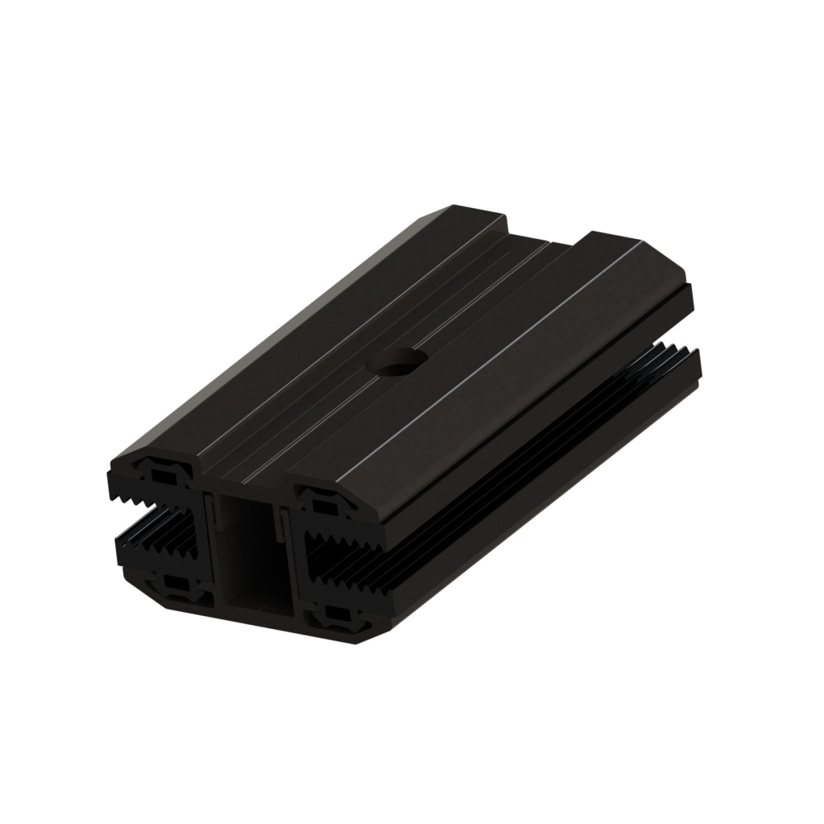 Laminatmittelklemme Click 5.0 zur Modulbefestigung schwarz. Länge: 100mm; für Module mit einer Glasstärke von 5.0 - 6.2 mm. Bitte beachten, je Modulklemme ist eine Zylinderschraube und MK2 notwendig, diese sind nicht im Artikel enthalten. Oberfläche: stangeneloxiert in E6/C35; Material: EN AW 6063 T66; EPDM