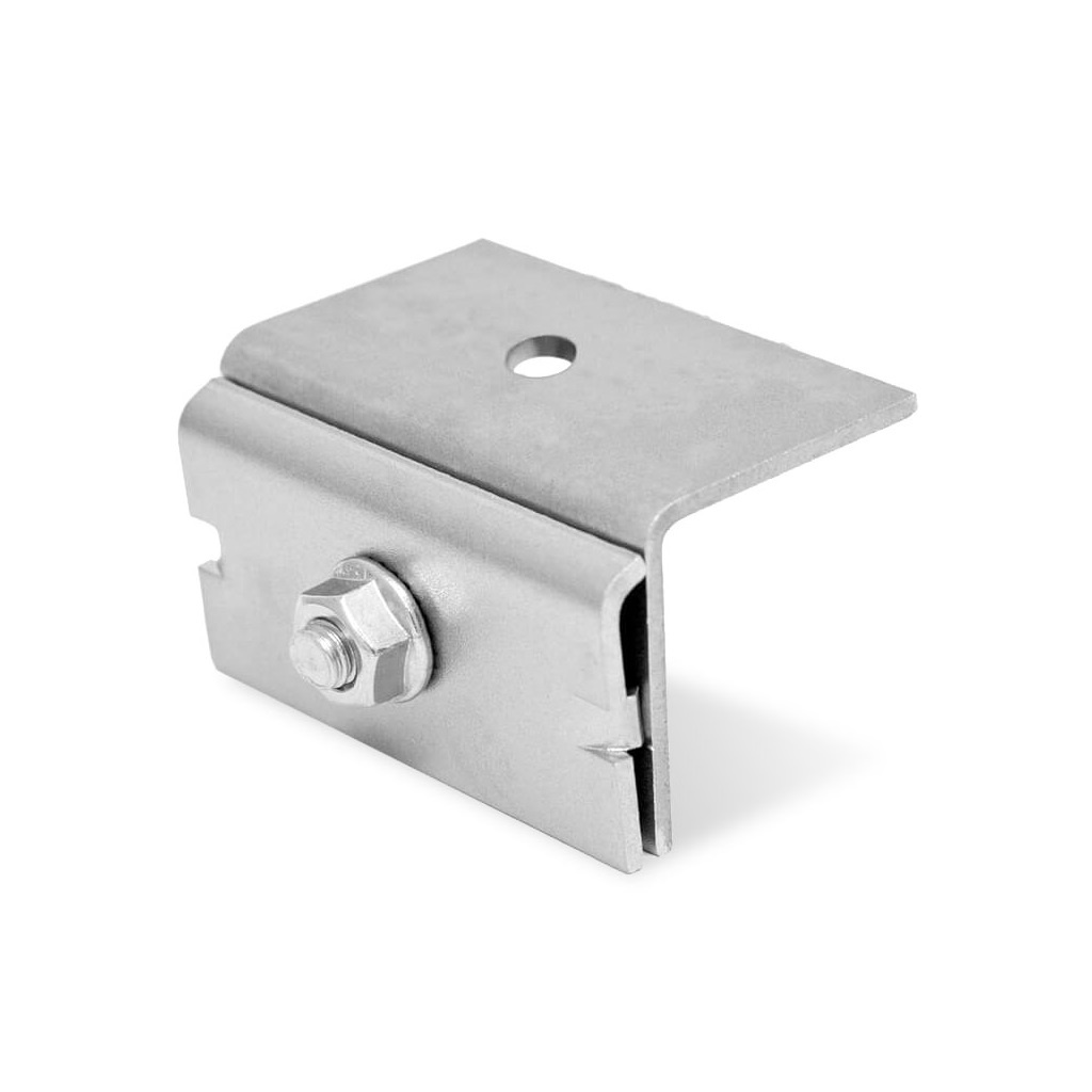 Morsetto per lamiera con foro rotondo per il fissaggio del K2 SolidRail su tetti in lamiera con doppia aggraffatura. Campo di serraggio: 3,5 mm. Materiale: acciaio inox A2